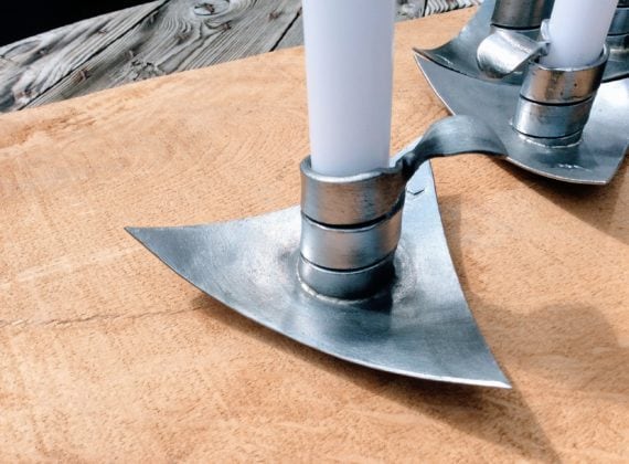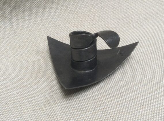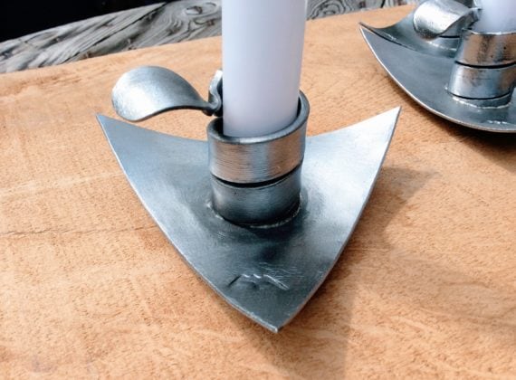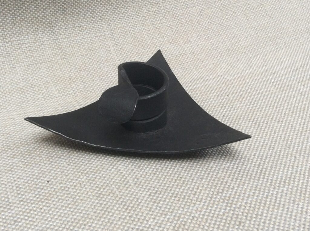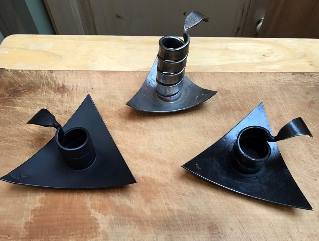 Triangular based candle holder with curled steel body and finger loop. Could be 'nested' to create an attractive table centerpiece.